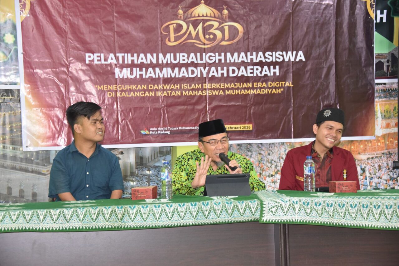 PADANG, POLIKATA.COM- Wakil Wali Kota Padang Maigus Nasir memberikan materi pada Pelatihan Mubaligh Mahasiswa Muhammadiyah Daerah yang digelar Dewan Pimpinan Daerah Ikatan Mahasiswa Muhammadiyah (DPD IMM) Sumatera Barat, di Aula Masjid Taqwa Muhammadiyah, Minggu (8/2).