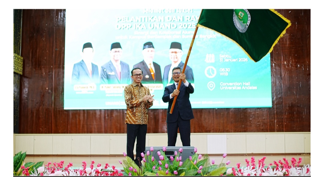 POLIKATA.COM- Universitas Andalas (UNAND) resmi mengukuhkan Ketua Umum dan Dewan Pengurus Pusat Ikatan Alumni Universitas Andalas (DPP IKA UNAND) periode 2025–2029. Pengukuhan dilakukan langsung oleh Rektor UNAND, Efa Yonnedi, Ph.D., dan ditandai dengan penyerahan pataka kepada Ketua Umum terpilih, Denny Abdi.