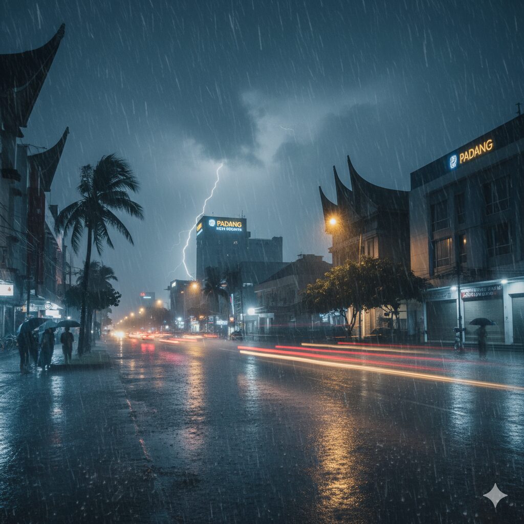 Sabtu (7/2/2026) malam, hujan lebat disertai petir sudah melanda sebagian besar wilayah Kota Padang. Hujan lebat terjadi sekitar pukul 19.00 WIB. Sebelumnya, sekitar pukul 18.00 awam hitam sudah menyelimuti langit Kota Padang.