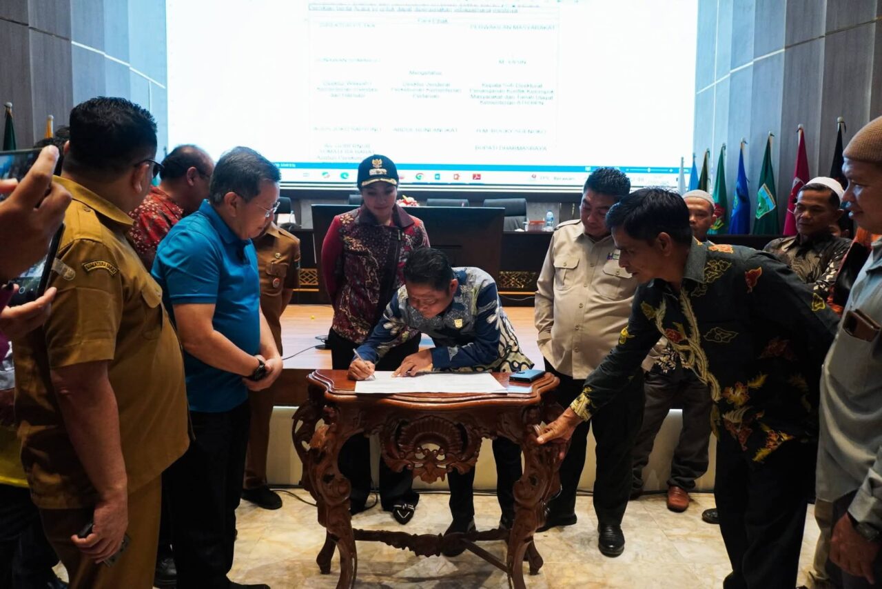 PENANDATANGAN- Asisten Perekonomian dan Pembangunan, Yefrinaldi saat menghadiri Penandatanganan Berita Acara PT. TKA dan Masyarakat Adat di Padang beberapa waktu lalu, terkait tuntutan utama masyarakat adat Nagari Alahan Nan Tigo dan Nagari Lubuk Besar adalah pemenuhan kewajiban kebun plasma sebesar 20 persen dari total Hak Guna Usaha (HGU) PT Tidar Kerinci Agung.