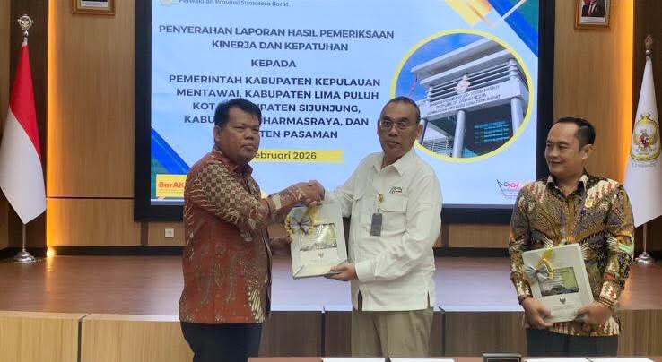 PADANG, POLIKATA.COM- Wakil Bupati Kepulauan Mentawai Jakop Saguruk, menerima Laporan Hasil Pemeriksaan (LHP) dari Badan Pemeriksa Keuangan (BPK) Republik Indonesia Perwakilan Provinsi Sumatera Barat, di Kota Padang, Selasa (10/2/2026).
